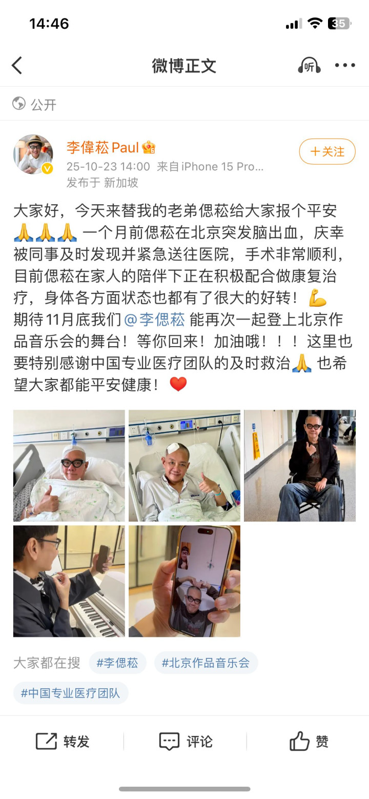 10月23日下午14:00,著名音乐人李伟菘发布微博提到,著名音乐人、弟弟李偲菘一个月前在北京突发脑出血,庆幸被同事及时发现并紧急送往医院,经北京专业医疗团队及时救治身体有了好转。李伟菘在微博中万分感谢“中国专业医疗团队的及时救治”,更祝福所有人平安健康。