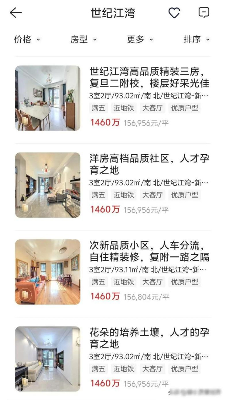 上海新江湾城的融信世纪江湾小区最近挺热闹,有五套房子同时挂出来出售,都是93平米的户型,总价全都标着1460万,连单价也一模一样是15.7万一平,这些房子的楼层有高有低,装修有的新有的旧,朝向也不完全相同,但价格却像铁板一块纹丝不动,这种事情放在谁眼里都觉得不对劲,正常的市场行情里根本不会出现这样的情形。