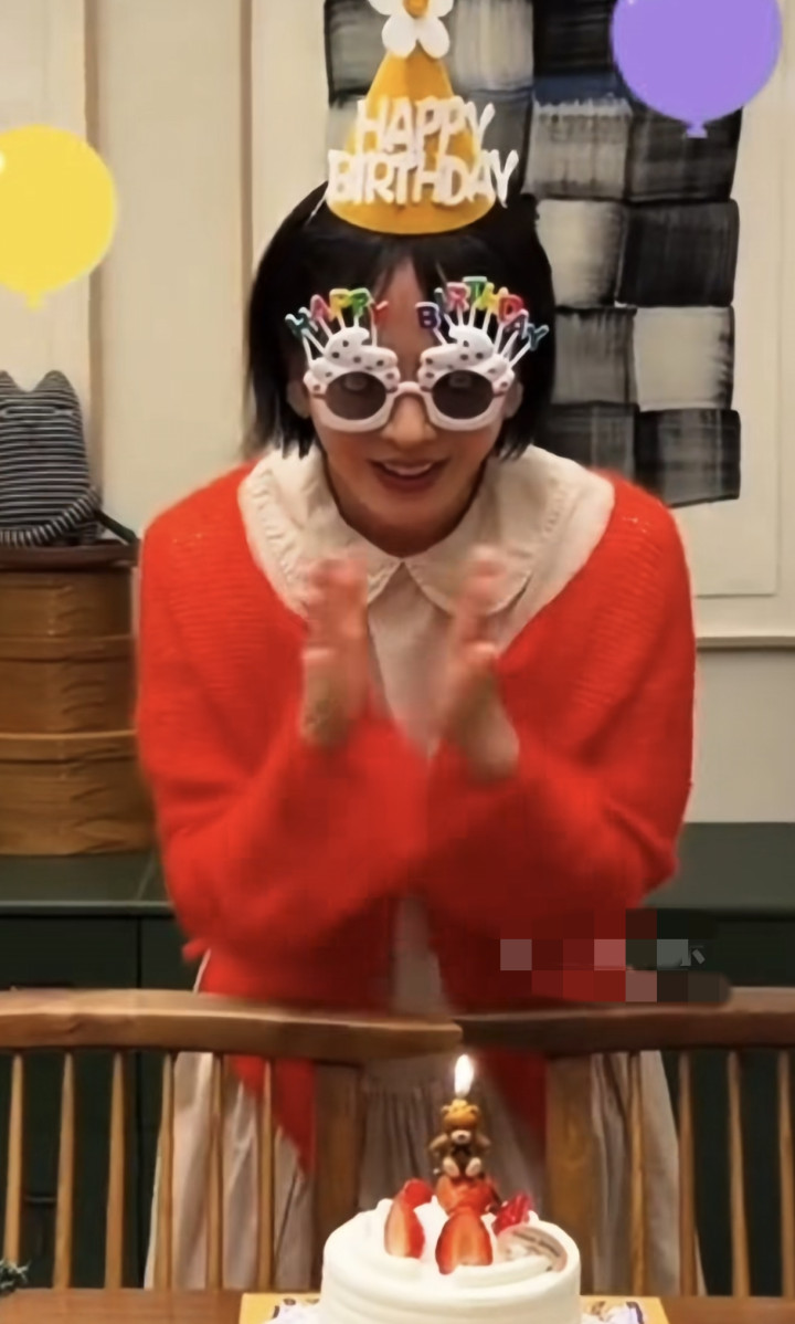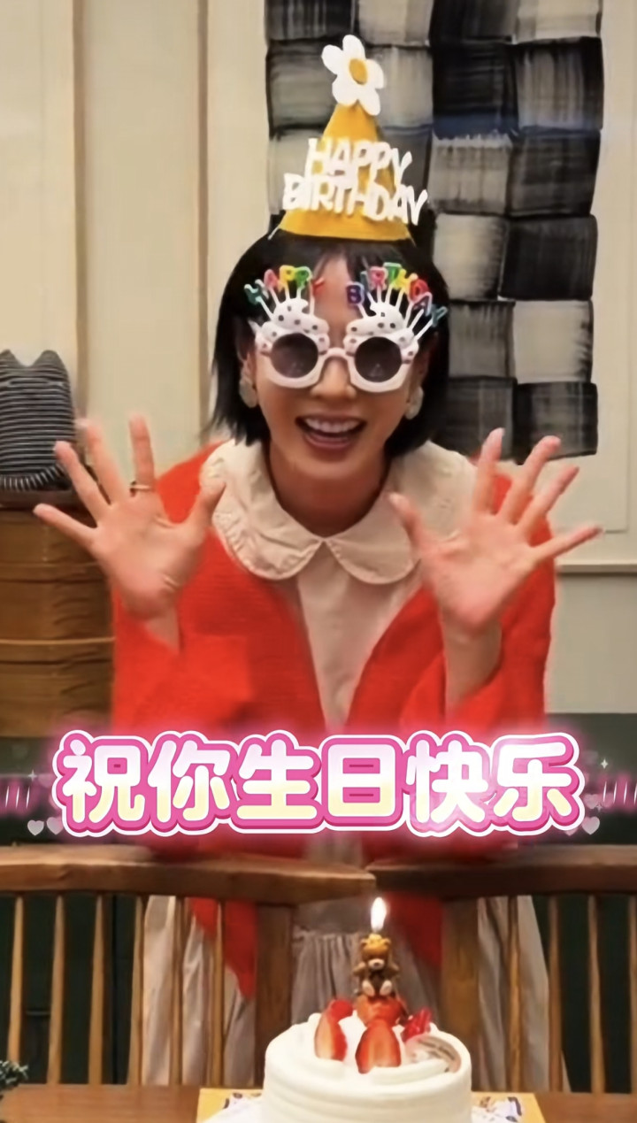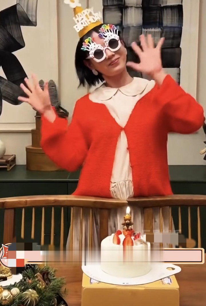视频中她穿着杏色的长裙搭配红色的外套,十分的喜庆。头上戴着生日帽,还戴了眼镜面前摆放了一个蛋糕,她幸福的看向镜头,因为镜头的对面是她和玄彬的儿子甜豆。