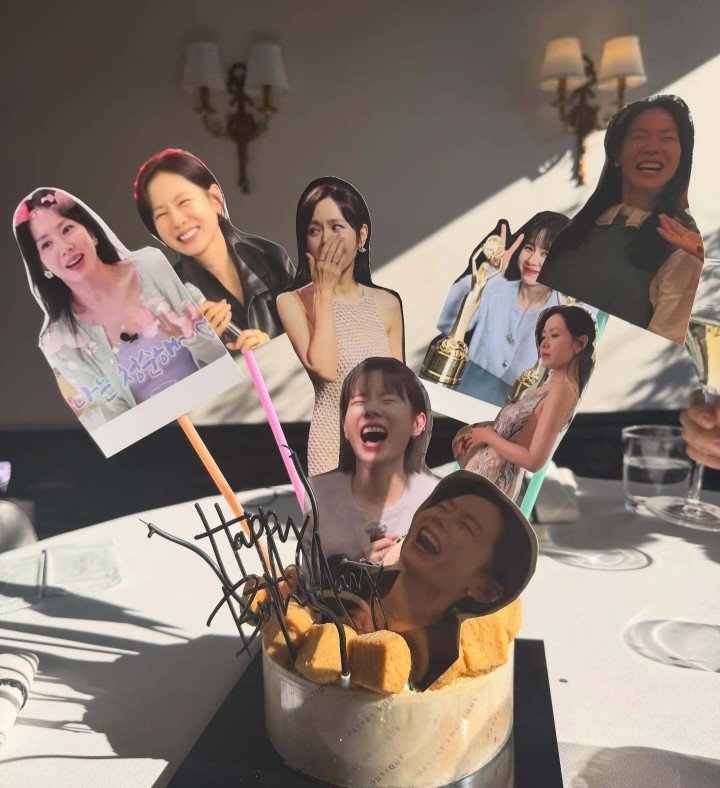 孙艺珍的这个生日蛋糕也很特别,上面插了很多孙艺珍的照片,每一张都是她大笑的样子,这也是朋友特地为她准备的,希望她每天都能笑口常开。