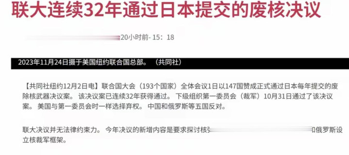 联合国大会的投票结果一经公布,便引发全球热议:147票赞成、5票反对、数十票弃权,日本主导的“废除核武器决议案”再度通过。与往年不同的是,这份裹着“和平”外衣的决议,首次明确点名要求中国加入美俄核裁军框架,其试图逼迫中国“自废武功”的政治图谋昭然若揭,而中俄的反对票,成为守护公平正义与国家安全的坚定防线。