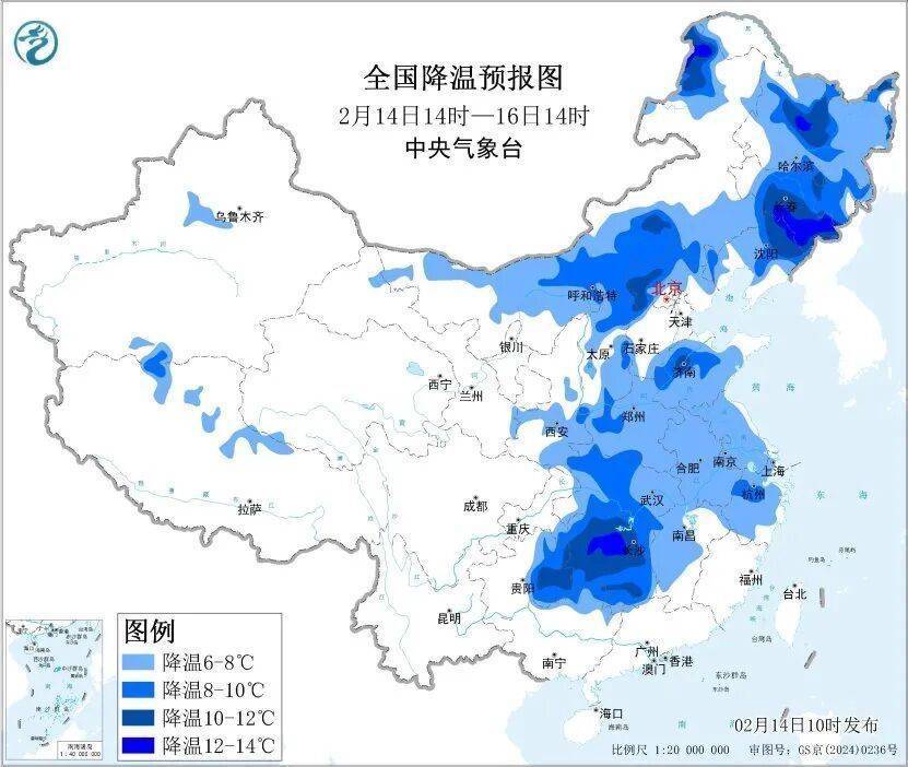 r受寒潮影响,预计2月14日至16日,我国中东部大部地区气温将自北向南下降6℃至10℃,内蒙古中部、东北地区中东部、黄淮西部、江汉北部、江南中西部等地下降10℃至12℃,局地降温可达14℃以上。长江中下游以北部分地区将有4至5级偏北风,阵风6至8级。